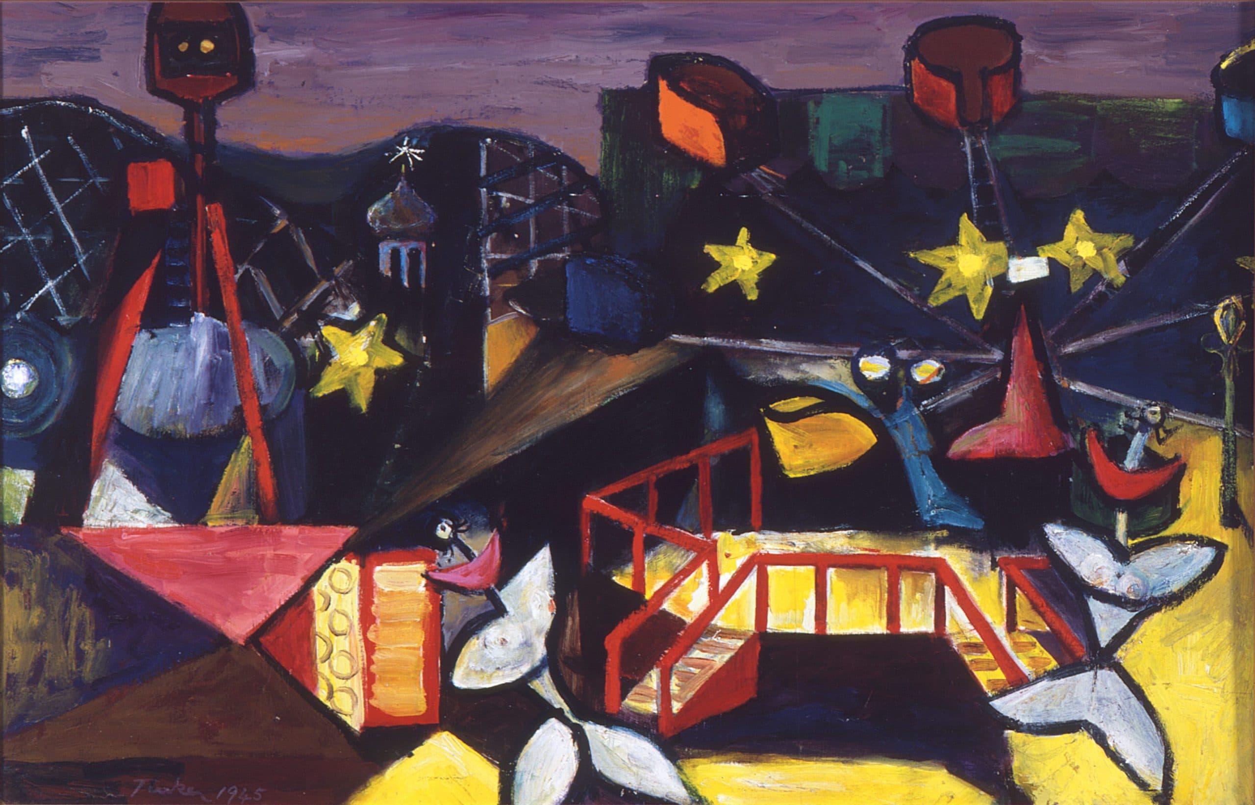 Many of Tucker’s best known paintings on this theme are presented in this exhibition, together with photographs and related archival material that convey a sense of the fast-paced cabaret underlining his carnivalesque vision of society. Also included are works that explore Tucker’s little-known involvement in the left-wing New Theatre productions in Melbourne for which he designed and painted sets in his early career.