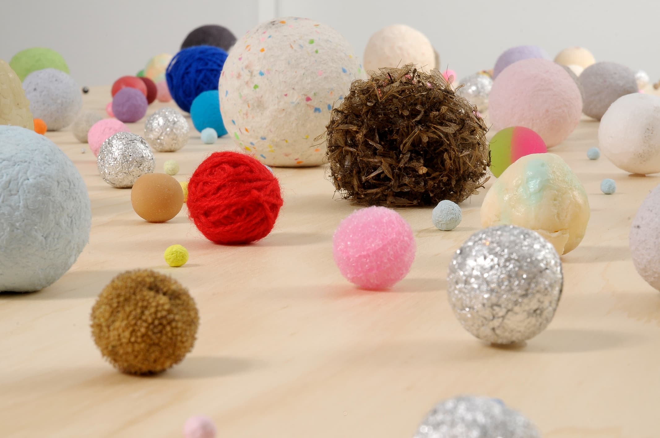 Charlie Sofo is a young Melbourne artist who works across a range of mediums – sculpture, video, drawing, actions and text. He makes artworks out of the incidental details of life, finding meaning in simple processes, materials and actions. Sofo’s whimsical sculptures are often made from ordinary objects and seemingly insignificant, non-art materials gathered from his daily surroundings – buttons, lint, tablets, rubbers bands, foil wrapping for chocolates, dog-eared pages from books, to name just a few. Such humble items are collected, accumulated and re-configured by the artist into works that embody the traces of their original usage whilst taking on a new poetic life.