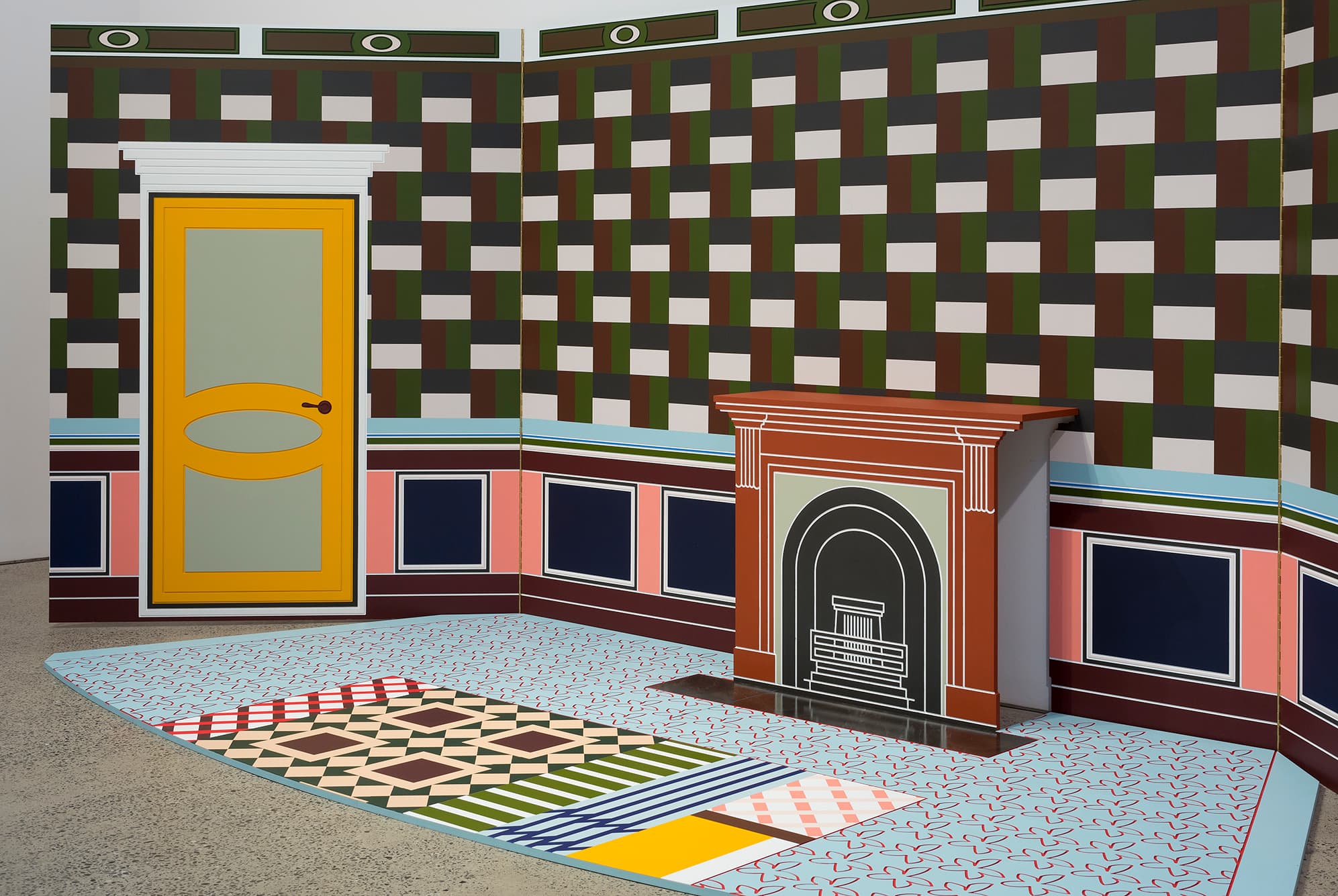 In recent years, Esther Stewart has made paintings and sculptures using geometric designs that, while deriving from modernist abstraction, also reference the ornamental trappings of architecture and domestic interiors such as awnings, balustrades, lattices and tiles; marble veneers; patterns on carpets, rugs or wood panelling. Home decorating has associations with the feminine and Stewart uses this domestic vernacular to personalise her abstract language. Often blurring boundaries between art, architecture and design, such works also toy with being functional, like her recent sculptures that double as display screens for paintings, and her patterned carpets that can be displayed hung on the wall.
