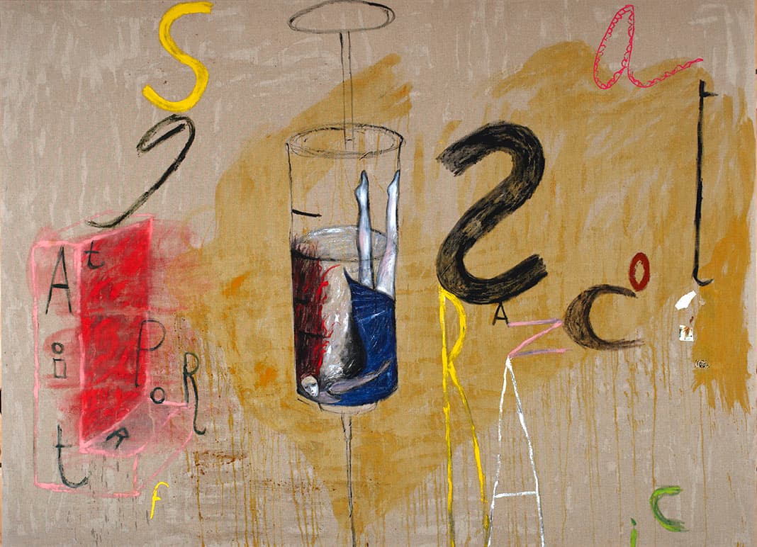 Inspired by both punk and feminism, Watson’s work uses distilled imagery and abbreviated text to create an intimate interior world. She has travelled widely since the 1970s and employs textiles collected on her travels as the surface for many of her paintings, which also often include collaged materials such as images from magazines, horse’s hair, ribbons, bows and sequins. Many of Watson’s works feature self-portraits and alter egos, a cast of longhaired women, horses, ballerinas, rock guitarists and cats, who enact life’s ongoing psychodramas.