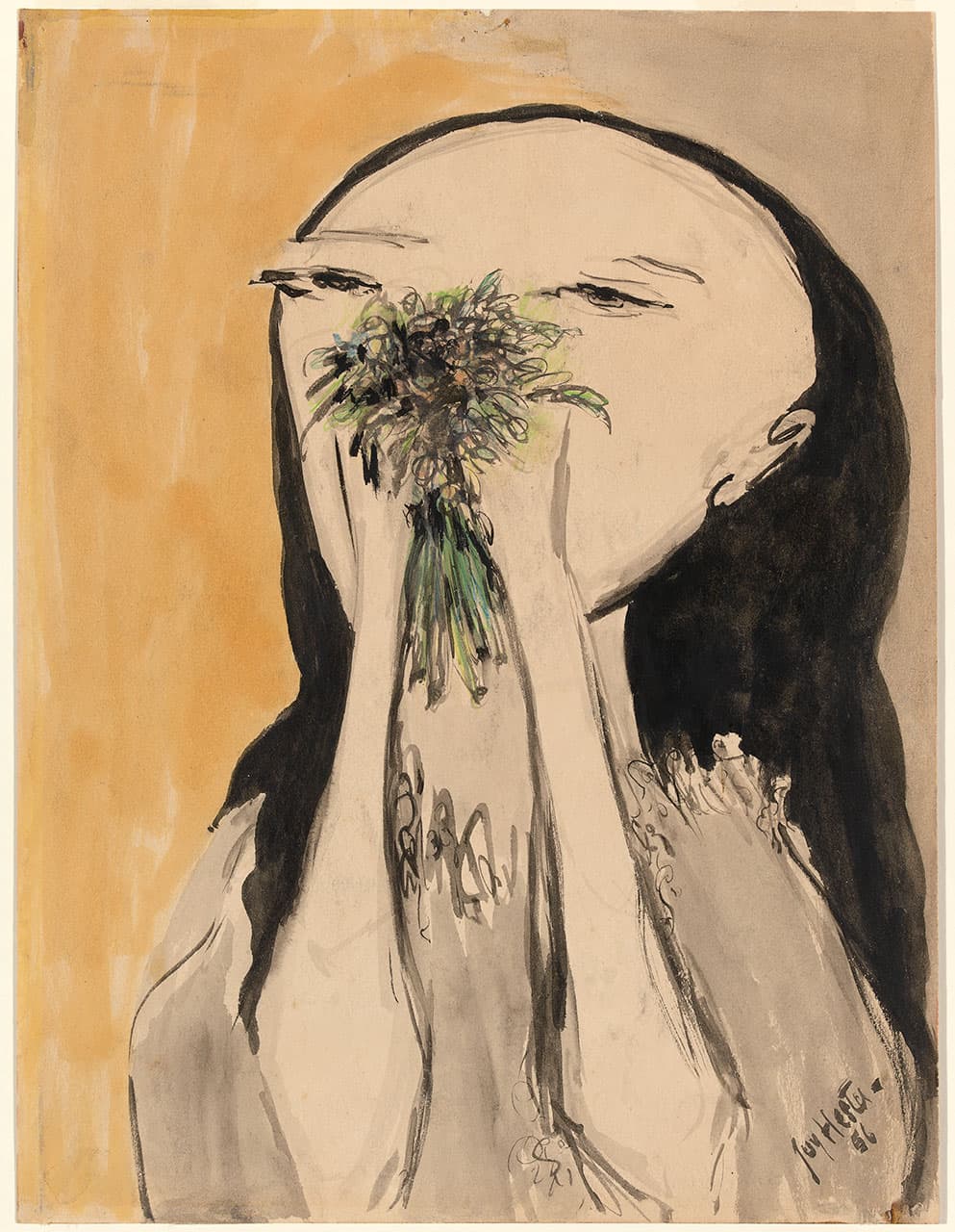 Joy Hester, Girl Holding Flowers 1956, brush and ink, watercolour, pastel on paper, 35.8 x 27.1 cm, Presented through The Art Foundation of Victoria from the Bequest of Violet Dulieu, Founder Benefactor 1997 © Joy Hester/Copyright Agency 2020
