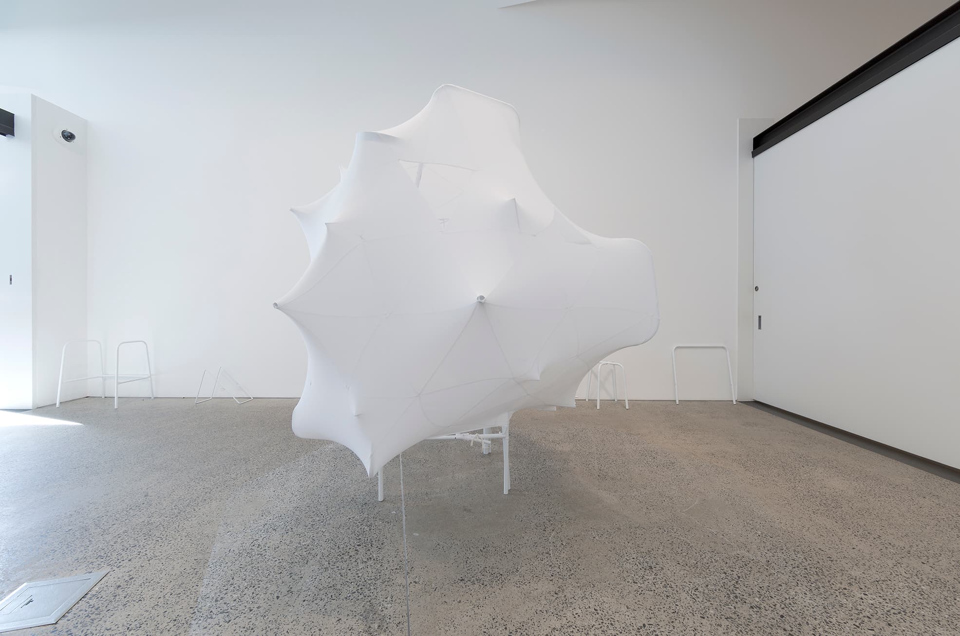‘Geodesic Envelopes’ emerges from Melanie Irwin’s interest in how our bodies are entangled with the angular and geometric structures of our environment and the architectural spaces we inhabit. Each weekend during the exhibition, live performers attempt to create a sphere out of a large costume of stretchy fabric using only their bodies and parts of everyday objects collected by Irwin from hard rubbish and junkyards. The whitened objects minimise distraction and focus our attention on processes and shifting abstract forms. Sewn from triangular lycra and mesh panels, the costume – also white – is a soft version of a geodesic dome of architect Buckminster Fuller, which over the course of the performance is stretched and manipulated into ever-changing abstract conglomerations that allude to the protective, isolating or modular potential of architectural form. Like the skin or the stomach, it responds to the rigidity of the objects. The performance emphasises the active agency of our bodies and their elasticity and adaptability in response to changing, demanding and constrictive circumstances.
