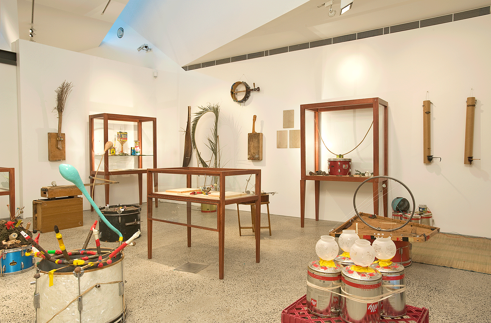 A visual artist and electroacoustic musician, Dylan Martorell creates sound-based installations and sculptures through an improvised layering of elements drawing on whatever materials and objects are to hand. In Musique Povera, Martorell presents a number of his hand-made musical instruments built from found materials such as discarded tins, plant matter, wood, rocks and metal, and displays a series of drawings on plywood that also function as musical compositions. His work reflects a mix of cultural influences including Southeast Asian music traditions and the early American diddley bow whilst also acknowledging links with the European movements of French Musique Concrete and Italian Arte Povera.