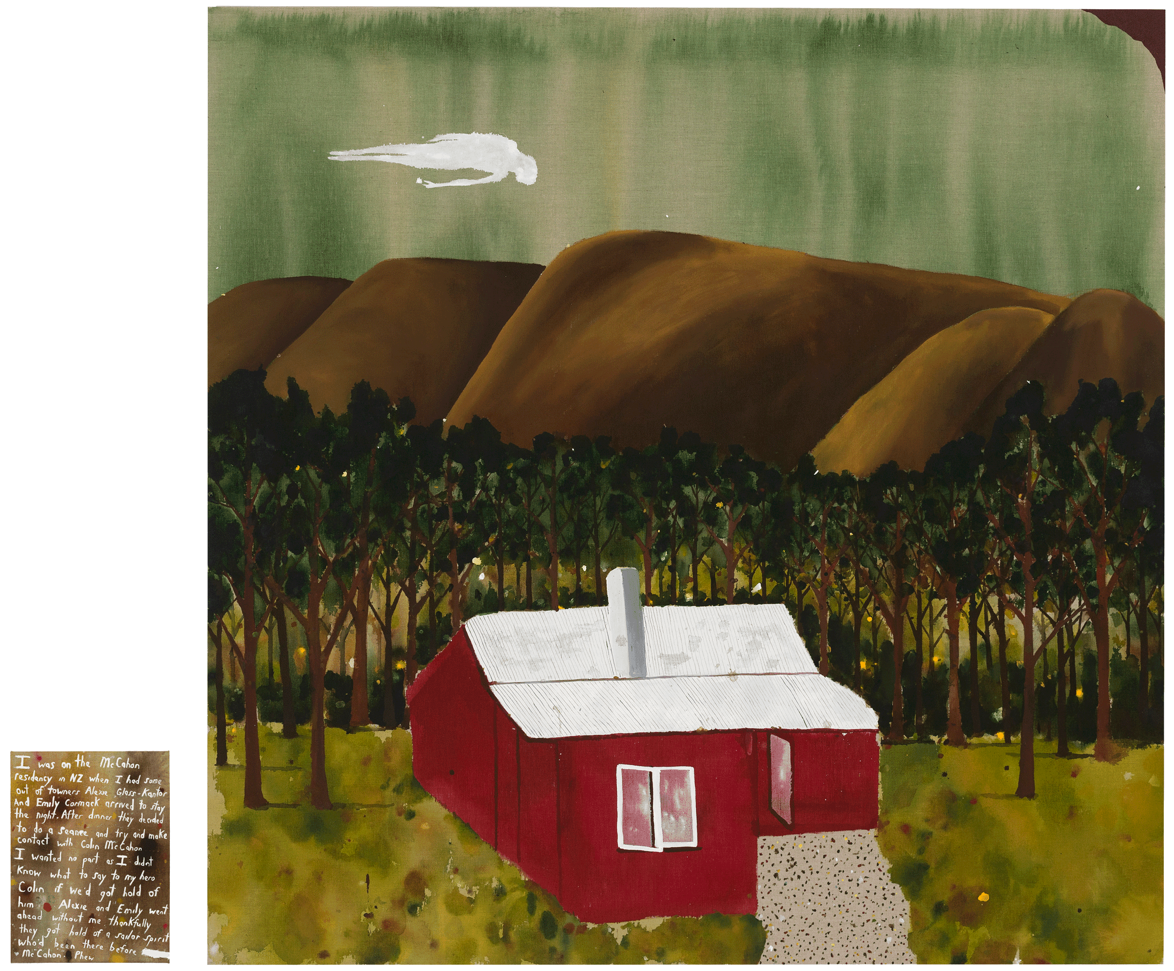 Richard Lewer, I was on the McCahon residency in NZ when I had some out of towners Alexie Glass-Kantor and Emily Cormack arrived to stay the night. After dinner they decided to do a seance and try and make contact with Colin McCahon. I wanted no part as I didn’t know what to say to my hero Colin if we’d got hold of him. Alexie and Emily went ahead without me and thankfully they got hold of a sailor spirit who’d been there before McCahon. Phew 2024, acrylic on linen, 200.0 x 200.0 cm, accompanying text: acrylic on linen, 41.0 x 31.0 cm, courtesy the artist and Jan Murphy Gallery, Brisbane, purchased through the Ann Bennett Acquisition Fund 2024