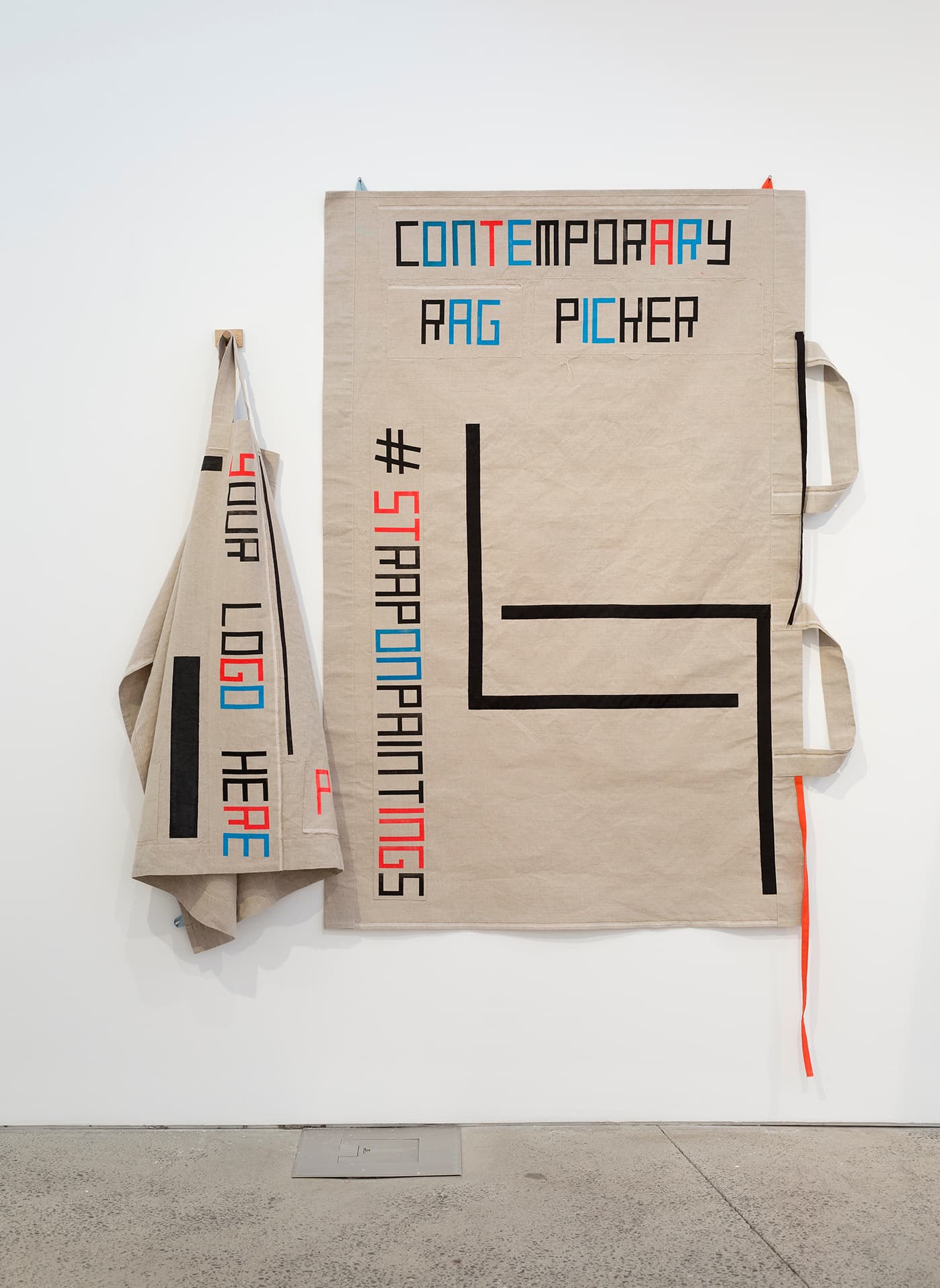 Visitors are invited to try on aprons made of Belgian artist’s linen that are encountered as minimalist abstract canvases hanging on the gallery wall, then post photographs of themselves on Instagram. The geometric forms and texts painted onto the aprons and accompanying accessories are inspired by a variety of sources; from a series of little known diagrammatic images by the avant garde Swiss artist Sophie Taeuber-Arp, to artworks in the Heide collection by Australian practitioners such as Kerrie Poliness, Madonna Staunton and Sidney Nolan.